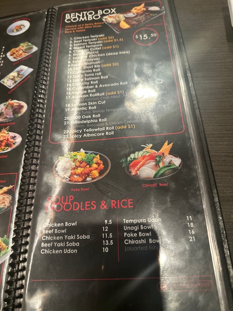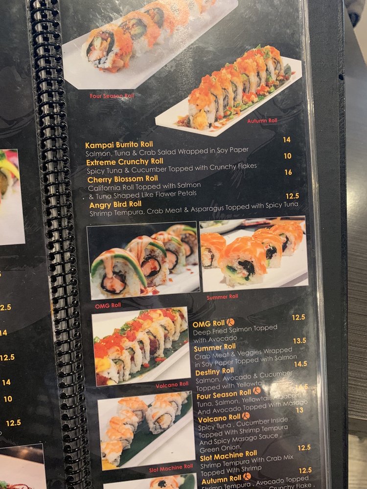 Inside: blue crab, avocado, cucumberTop: salmon, tuna, shrimp, green onion, masago, crunchy flakes