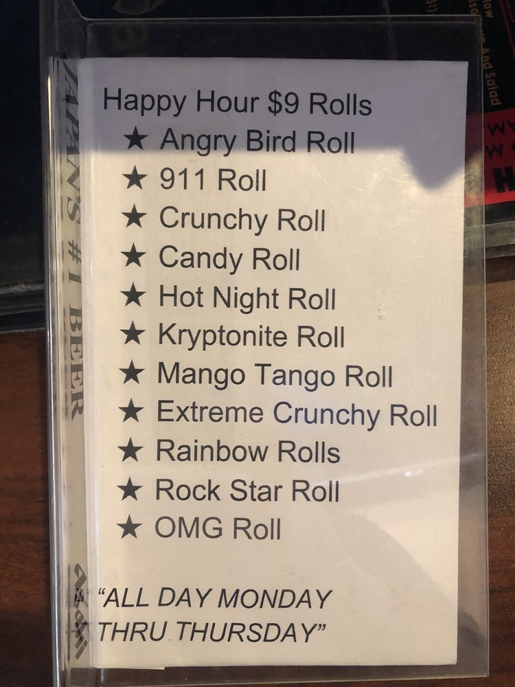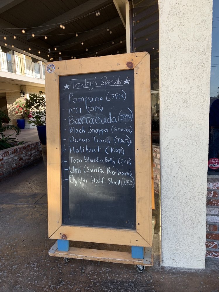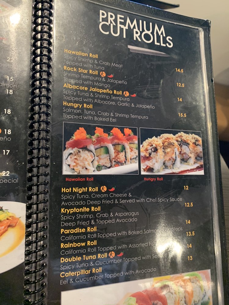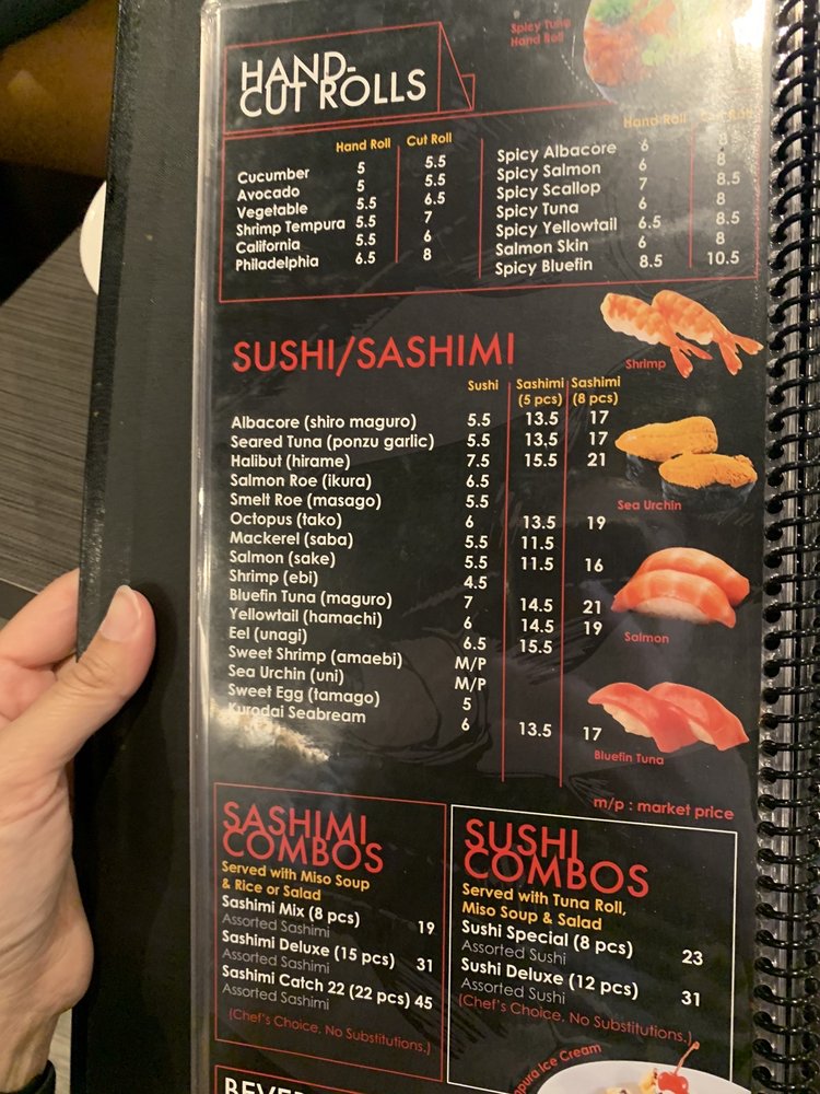 Inside: tuna, salmon, yellowtail, avocado, mango, crab salad, and green mix